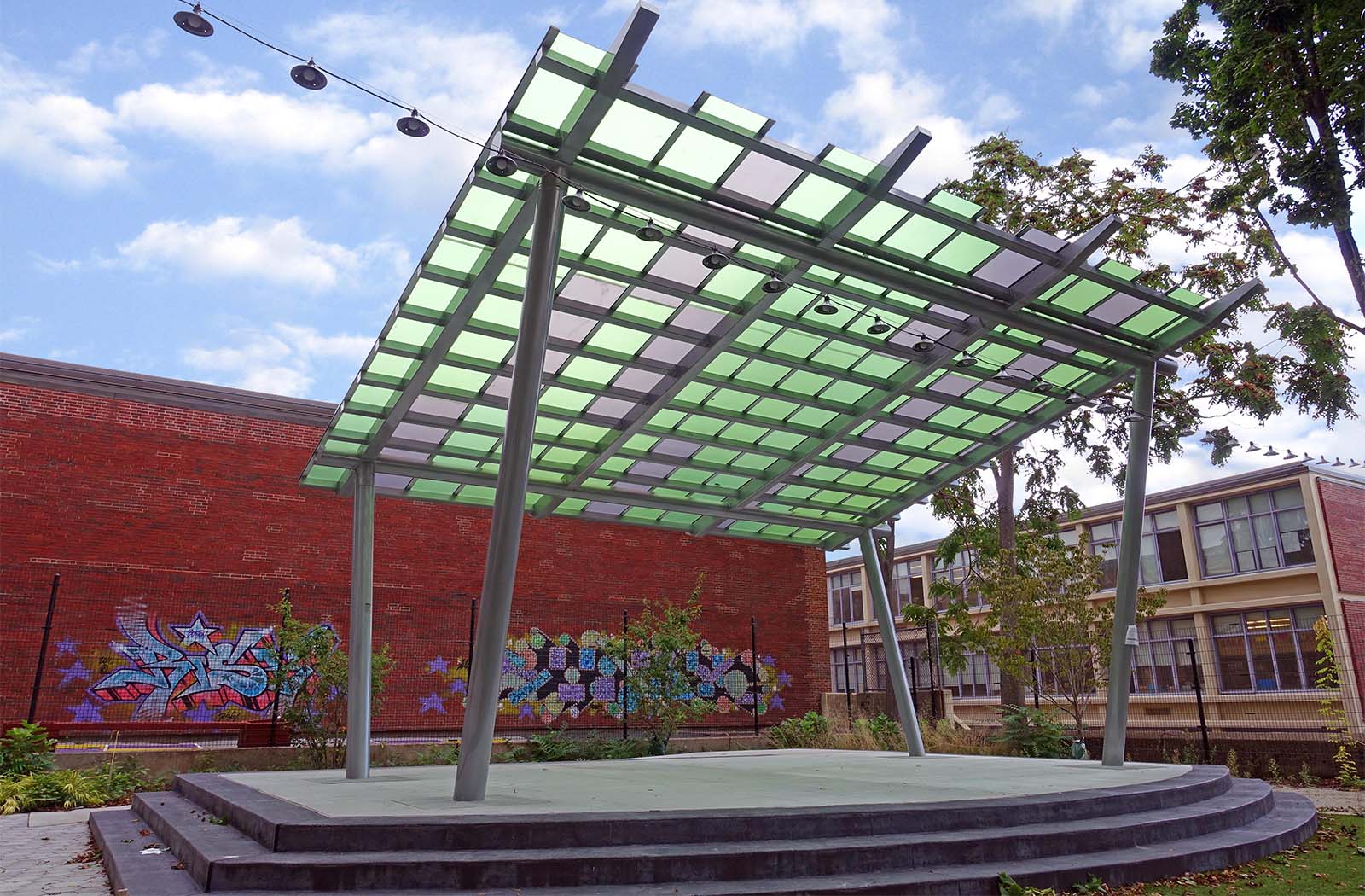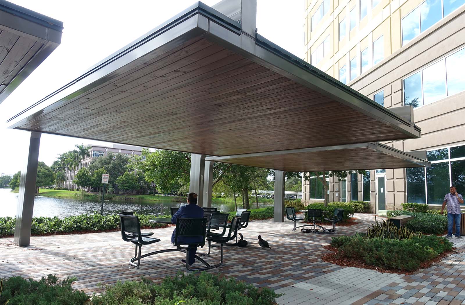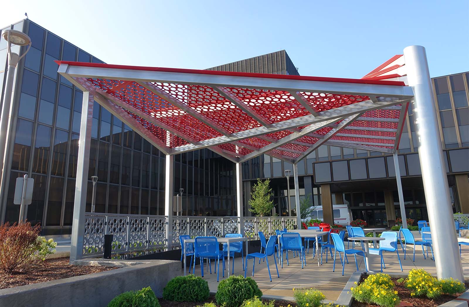 The owner and architect wanted to create a gathering space near the main entrance where patients and families could safely enjoy the outdoors without leaving the campus. Key amenities and a shelter were put in place so the area could be used year-round as a retreat for patients and their visitors to relax outside of the hospital.