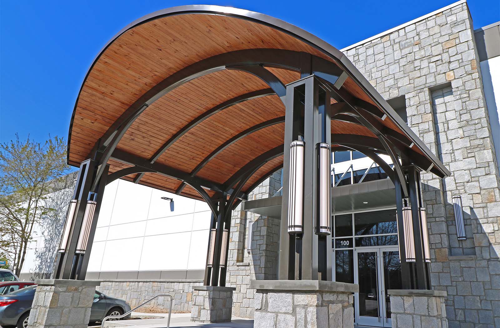 The client wanted a statement entrance canopy that would offer their employees and visitors a warm welcome into their facility. The wood tongue and groove underlayment and stone column wraps bring natural materials into the steel elements, creating a comfortable space at the entrance point of the building. Lighting was also integrated into the quad post columns to add a unique design element by the architect.